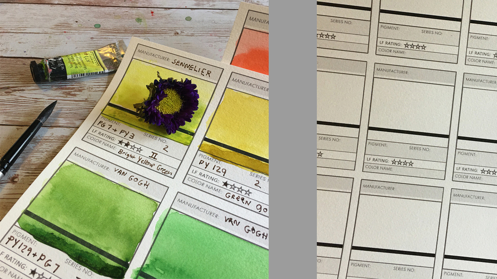 I've printed these sheets for you, cut to a convenient letter size (8.5x11.) There are places to track watercolor brand, lightfastness ratings, pigment codes (SO important!) and color names.